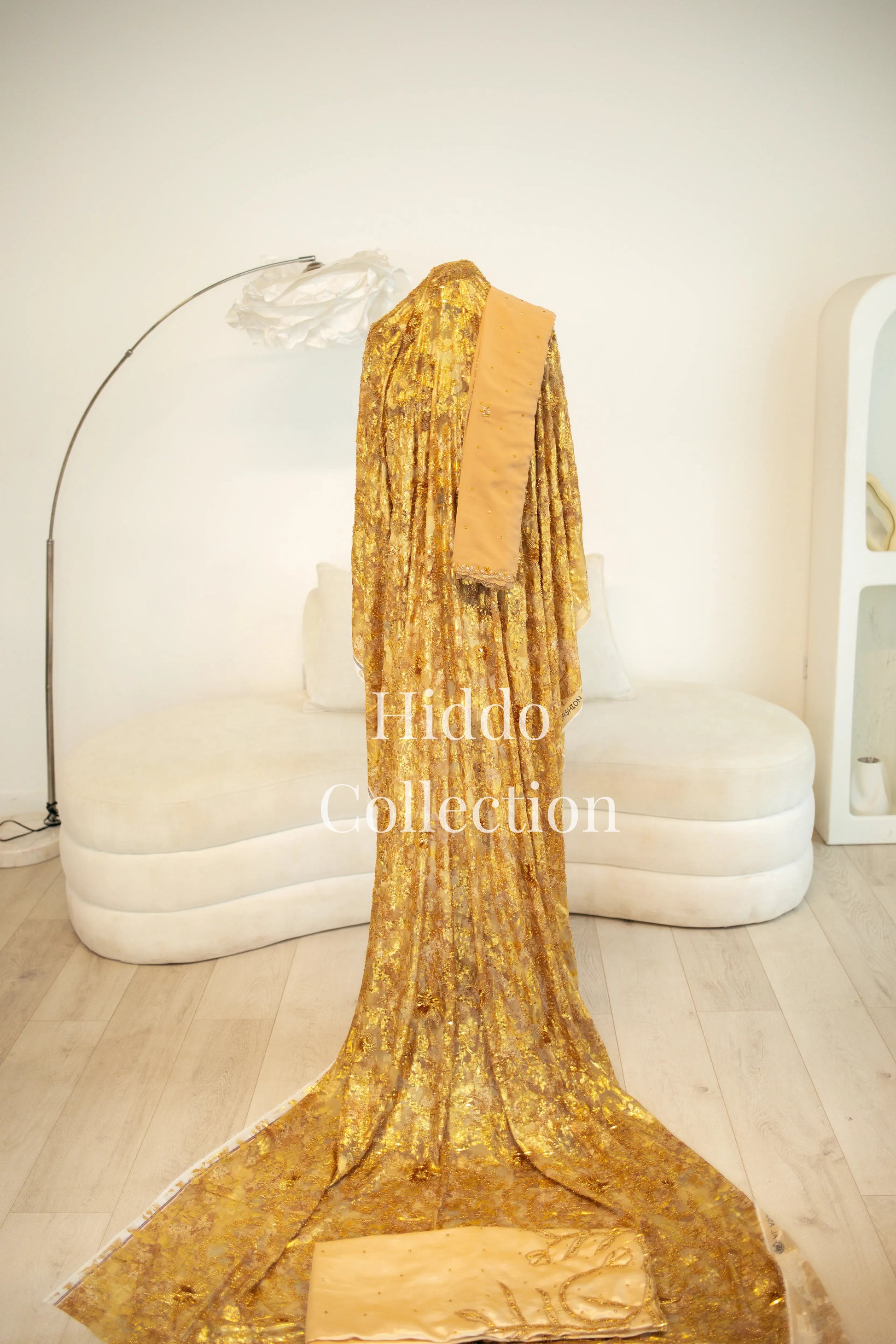 This rich gold Dirac glows with metallic shimmer and intricate sequin detailing that catches the light with every move.