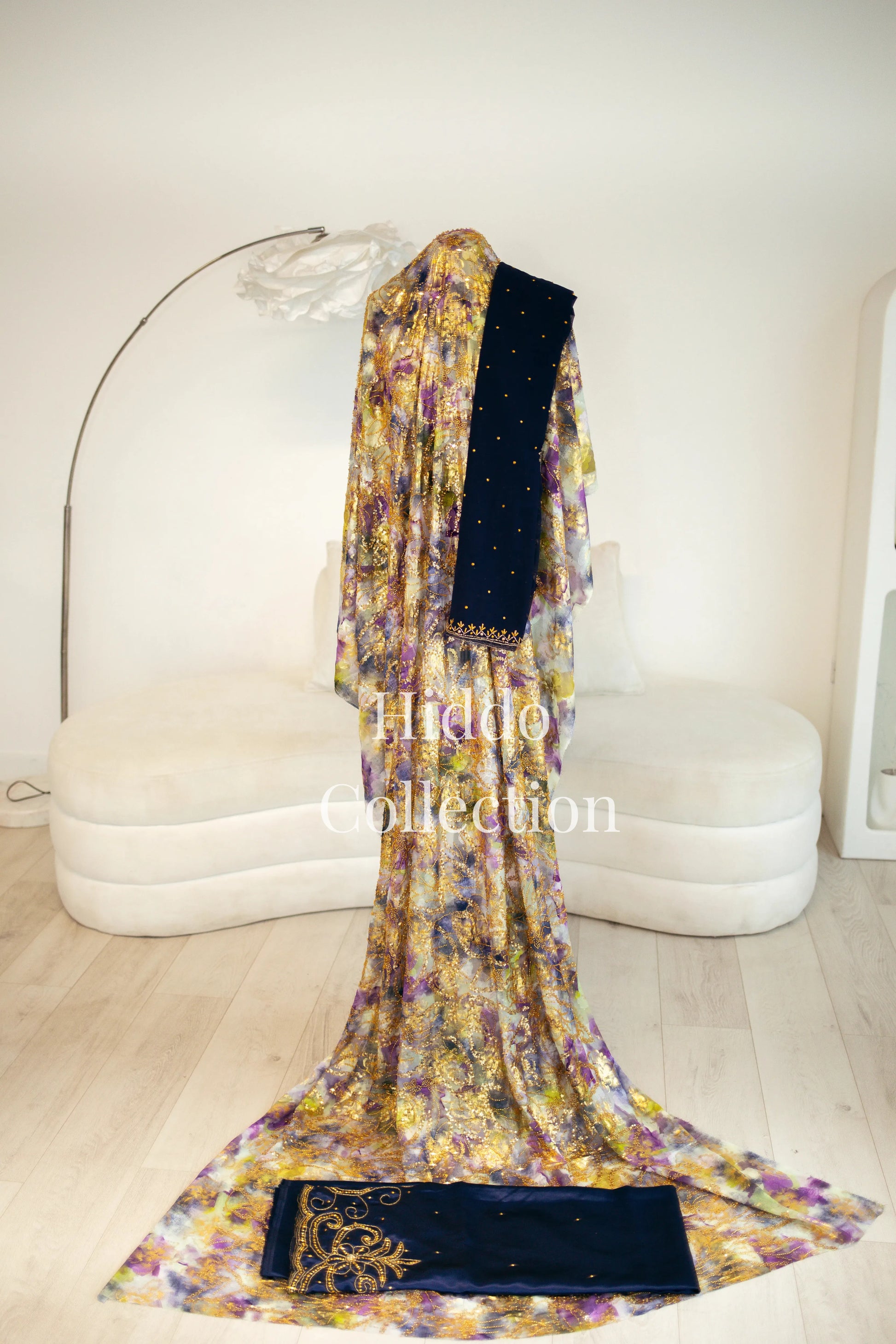 A dreamy blend of lavender, navy, gold, and soft yellow — this Dirac drips in sequins and floral embroidery.