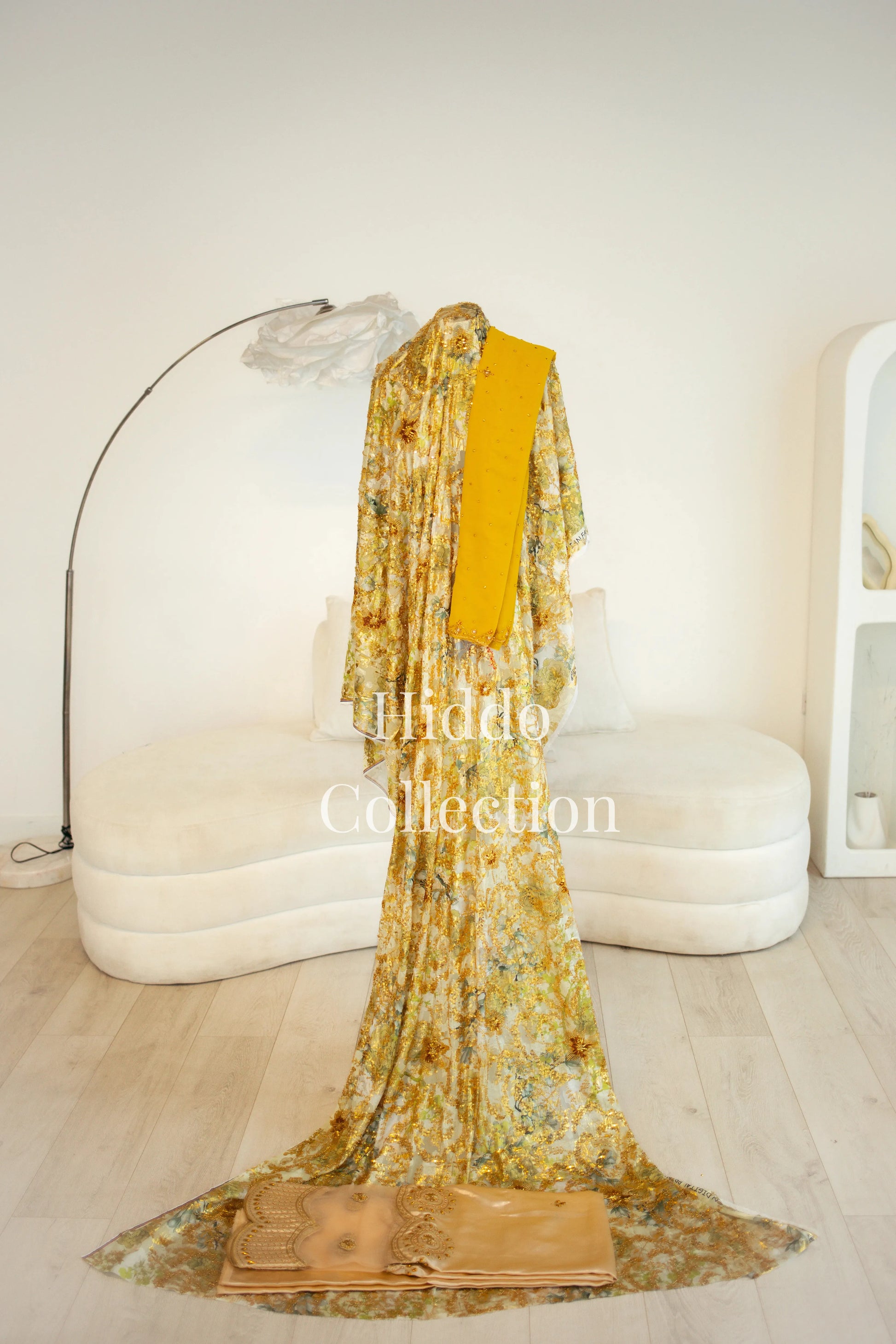 This Dirac pairs glimmering gold and soft turquoise florals with a bold mustard gabasaar (shalmad) and nude-toned gorgorad.