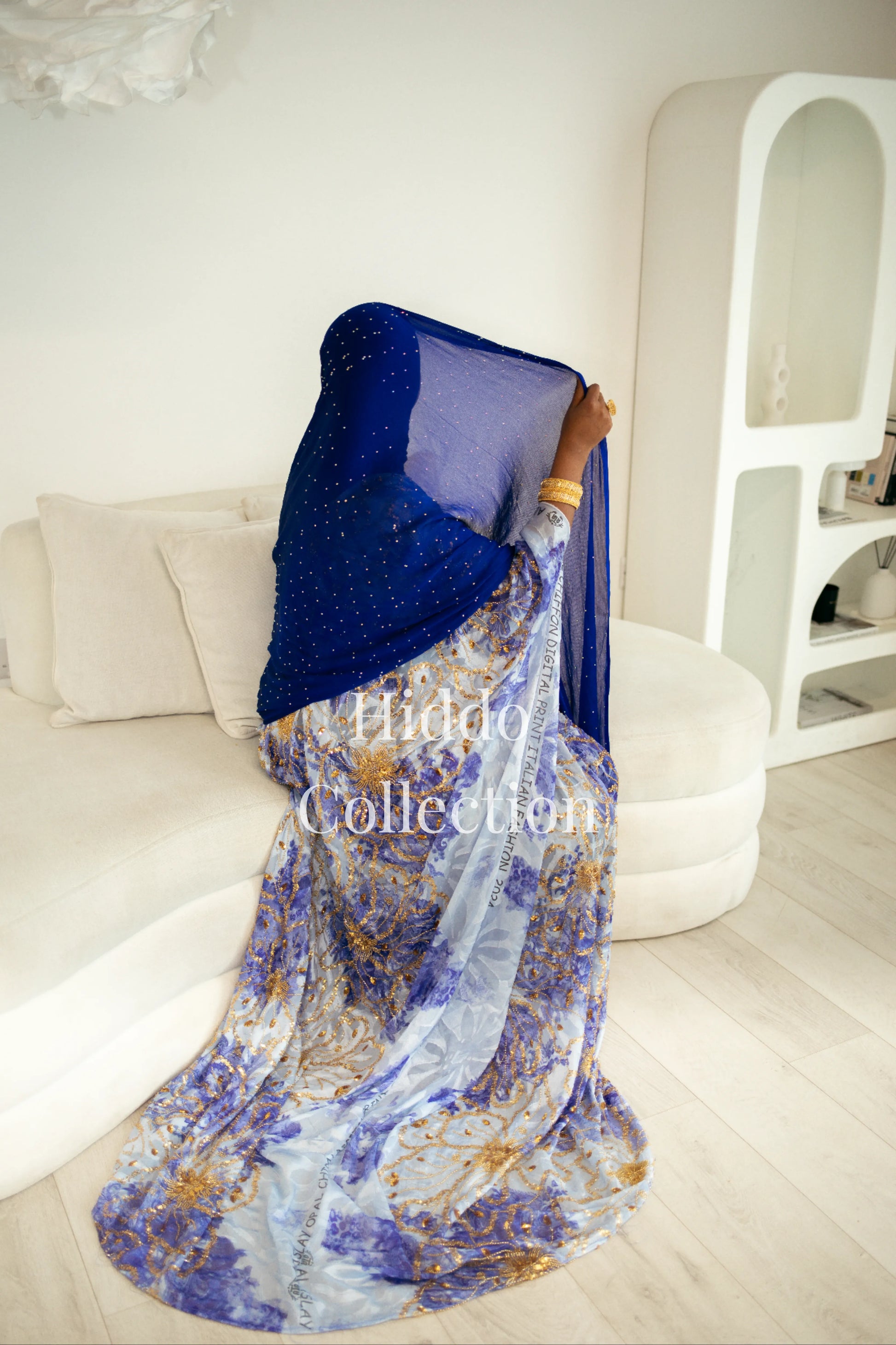 This show-stopping 3-piece Dirac stuns in a cool-toned palette of royal blue, lilac, and shimmering gold.