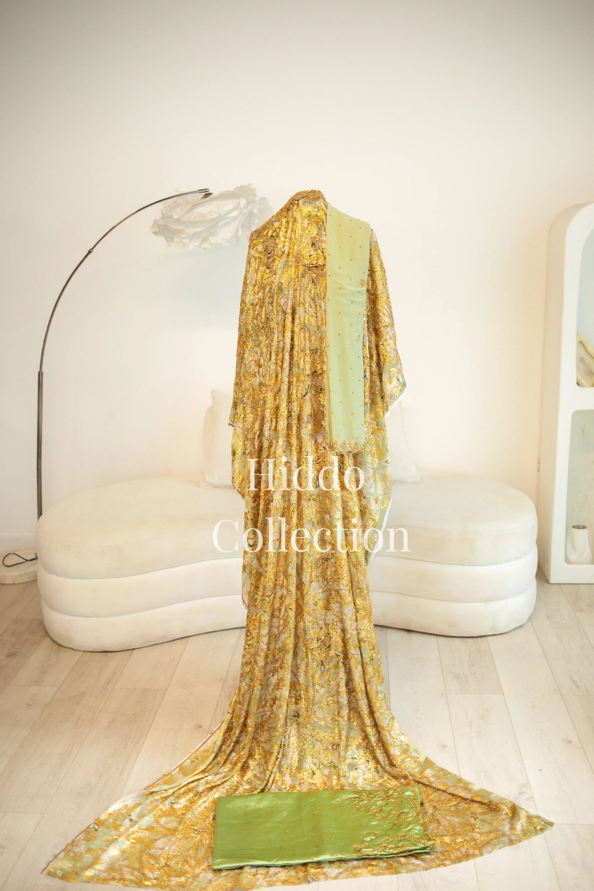 This Dirac features luminous gold sequins layered over soft pistachio tones, creating a look that’s radiant and refined.