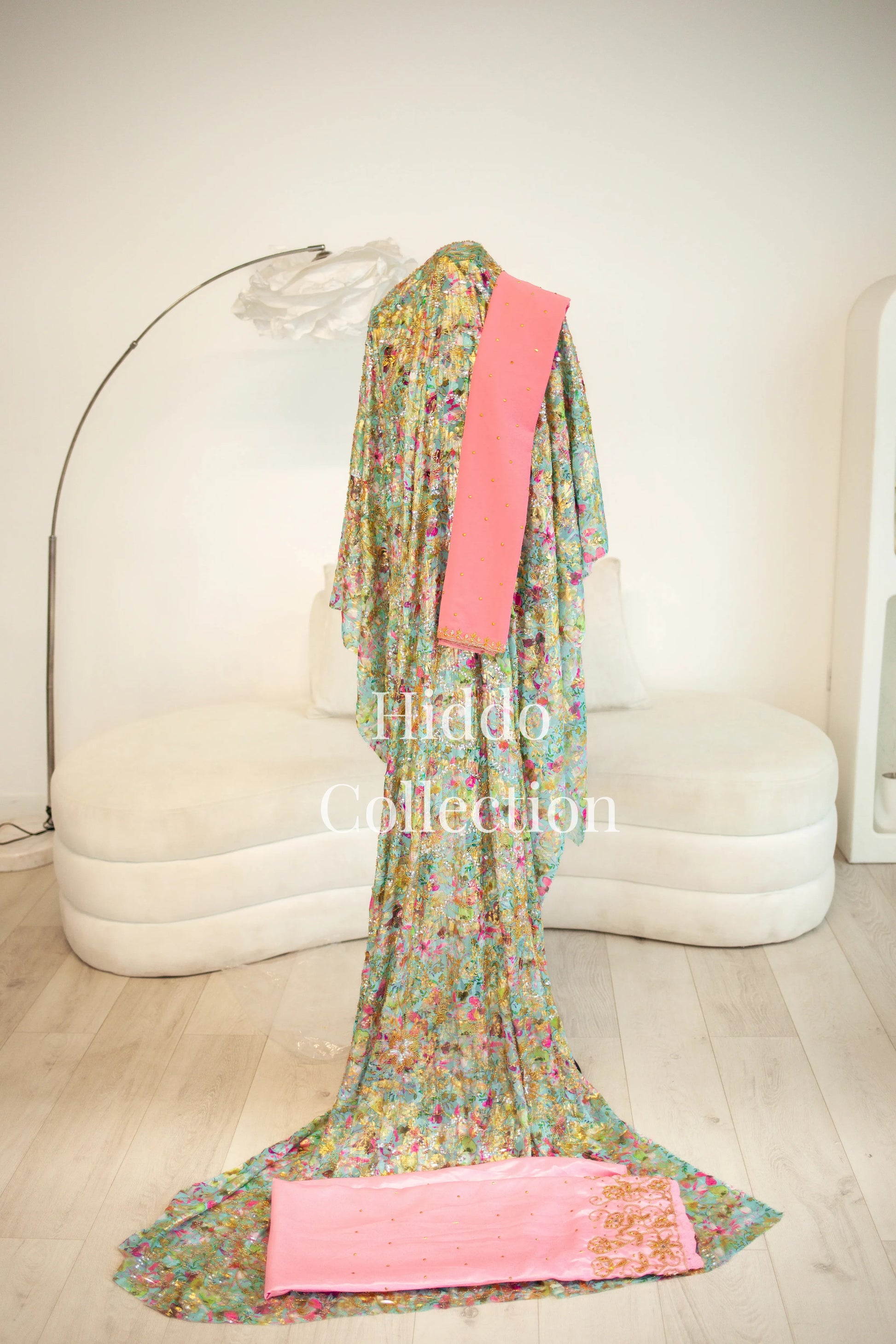 This three-piece Dirac blends soft turquoise, pops of pink, and golden shimmer for a look that feels like spring in motion.