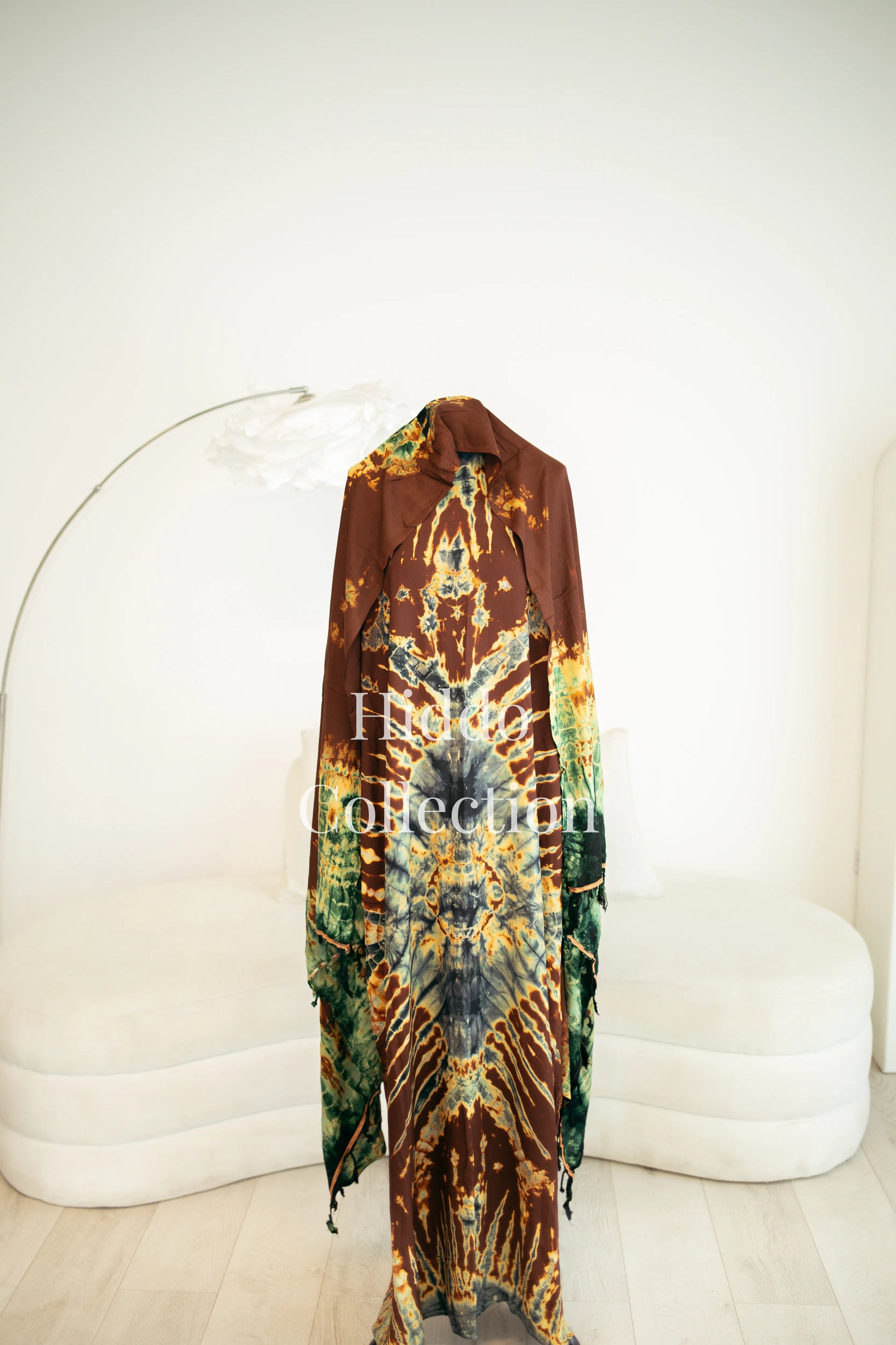 This tie-dye baati bursts with earthy tones—burnt brown, deep olive, golden yellow, and ash blue—forming a bold, mirrored design that’s impossible to ignore.